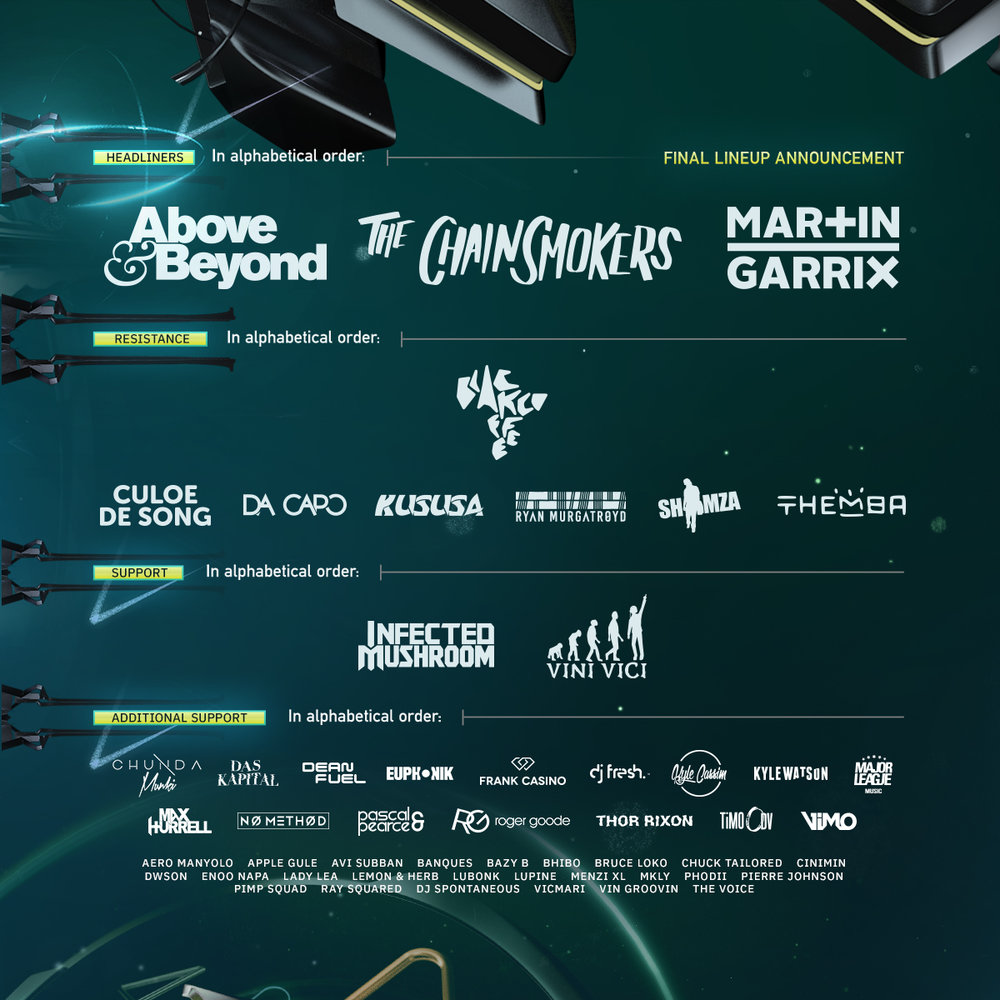 Dean FUEL, Fresh and Euphonik, Max Hurrell and No Method will be wowing dance music lovers on the main stage ahead of the international acts while the Resistance stage will be headlined by our very own Black Coffee and supported by Thor Rixon LIVE, MKLY, Vicmari, Pierre Johnson and Dwson in Cape Town and Lemon & Herb, Aero Manyelo B2B Bruce Loko and Avi Subban in Johannesburg.